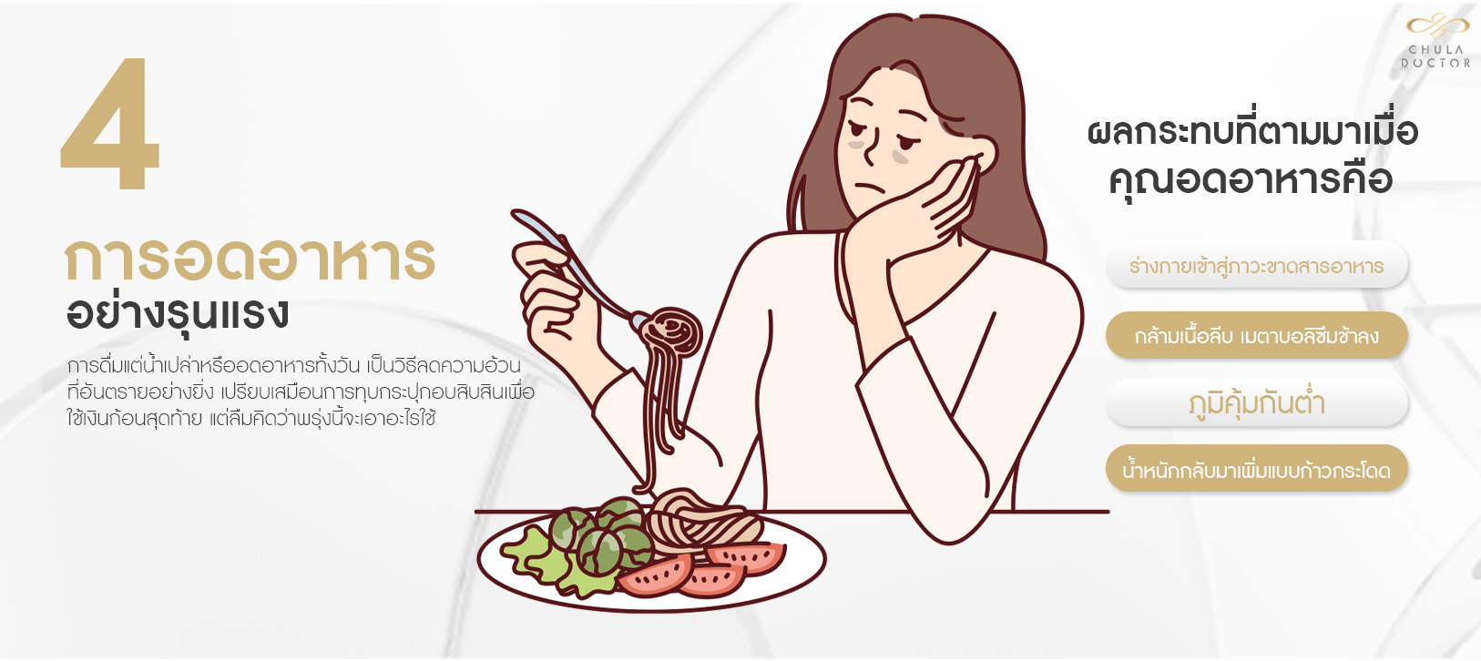 การดื่มแต่น้ำเปล่าหรืออดอาหารทั้งวัน เป็นวิธีลดความอ้วนที่อันตรายอย่างยิ่ง เปรียบเสมือนการทุบกระปุกออมสินเพื่อใช้เงินก้อนสุดท้าย แต่ลืมคิดว่าพรุ่งนี้จะเอาอะไรใช้