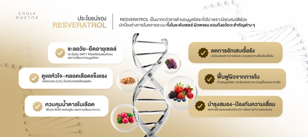 Resveratrol เป็นมากกว่าสารต้านอนุมูลอิสระทั่วไป เพราะมีคุณสมบัติช่วยปกป้องร่างกายในหลายระบบ ทั้งในระดับเซลล์ ผิวพรรม รวมถึงอวัยวะสำคัญต่าง ๆ