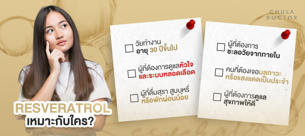 รังสี UV และมลพิษเป็นตัวการทำให้เกิดอนุมูลอิสระในผิว Resveratrol จะช่วยต้านการอักเสบและลดความเสียหายต่อเซลล์ผิว จึงเหมาะกับคนที่อยากป้องกันริ้วรอย ฝ้า กระ และผิวหมองคล้ำ - ผู้ที่ต้องการดูแลหัวใจและระบบหลอดเลือด